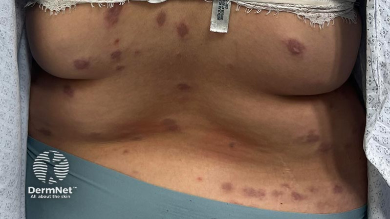 This 30-year-old woman presented with an erythematous rash on her back and thighs. The lesions started a year ago, and were not itchy or tender. More lesions were developing over time.