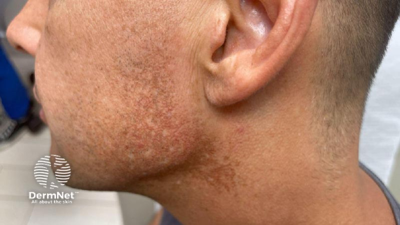 A 45-year-old male presented with progressive discolouration on both sides of his face for one year. He reported no pain or itch. Of note, the patient worked as an automobile salesperson.
