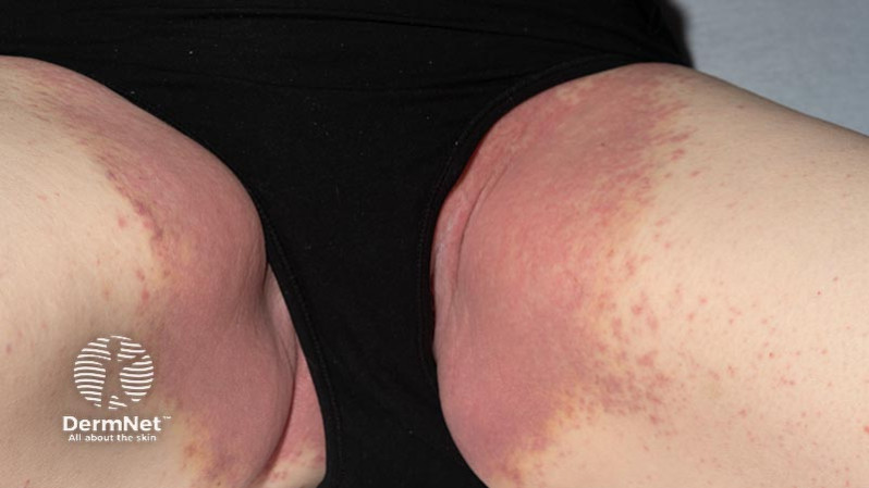SDRIFE occurs within hours to days after exposure to the causative drug. It generally manifests as well-defined redness of the buttocks, natal cleft, and upper inner thighs. The redness is usually symmetrical. Other major body folds such as axillae and neck may also be affected.