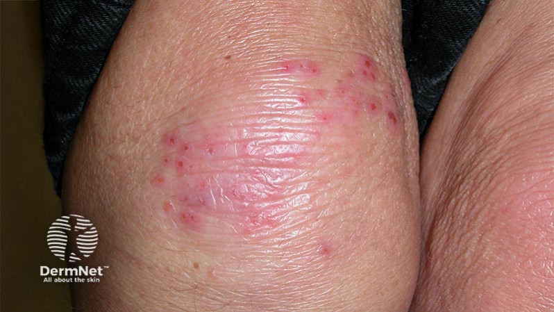 This 60 year-old lady has developed intense itching symmetrically over her knees, elbows, sacrum and scalp. She had noticed tiny blisters in the affected areas, but because she is so itchy she has scratched and ruptured them.