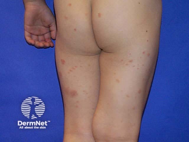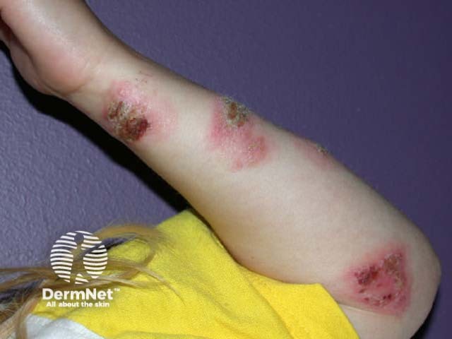 The initial lesions are papules or vesicles, which form confluent plaques. The plaques may be crusted, weeping or blistered and are intensely itchy. Secondary infection with pustules, pain and spreading erythema is not uncommon. Older lesions may be dry and excoriated.