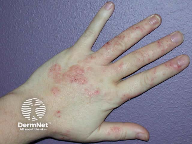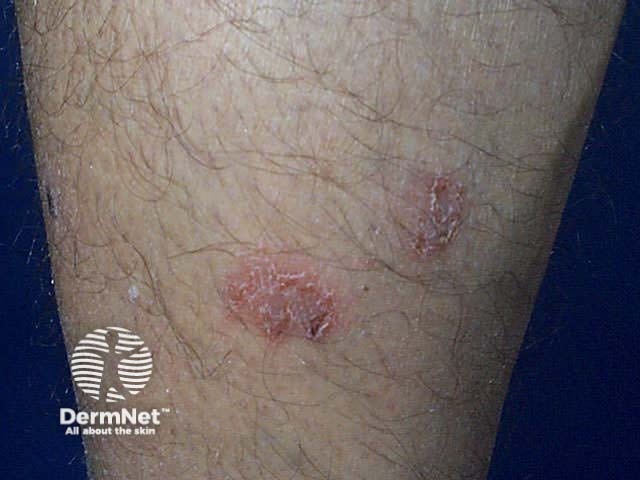 Clusters of round or oval plaques may be localised to lower legs, the backs of the hands or other sites. Nummular dermatitis may also generalise to affect scalp, face, trunk and limbs. Generally the eruption is scattered, but sometimes the plaques are distributed symmetrically. In-between skin appears normal.