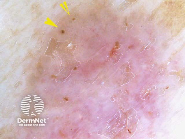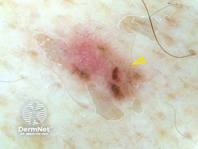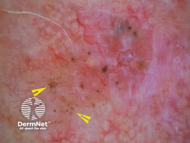 The vascular pattern may be quite distinctive and allow diagnosis of a pink skin lesion, in the absence of pigmentation or dermoscopic structures. If using a contact dermatoscope, take care not to press down on pink lesions, which will exsanguinate the vessels and make diagnosis more difficult.