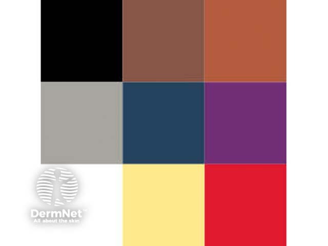 By dermoscopy, the pigmentation of the lesion is evaluated in terms of colour(s): black, dark brown, tan, grey, steel blue, purple, white, yellow and red.