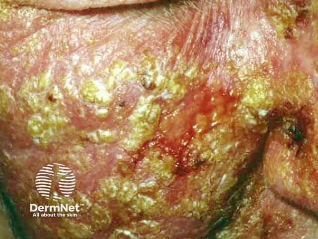 Eroded lower lip Necrotic BCC reaction Hypopigmentation Nodular recurrent BCC