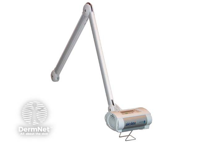 Reported effective doses vary from 30-540 J/cm2 depending on the light source used. These may be conventional incoherent sources, lasers or a portable diode system such as the Aktilite illustrated. This supplies a dose of 75 J/cm2 over about 8 minutes, with a continuous waveband of 570-670 nm.