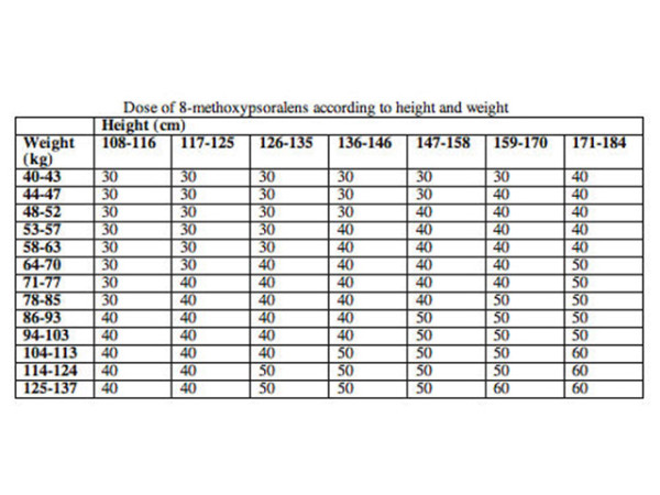 For oral 8-MOP, between 0.4 and 0.6 mg/kg body weight is usually effective, although some may need more, and others less. For 5-MOP, double this dose is necessary (1 -1.2 mg/kg body weight). Poor response to PUVA can be due to inadequate absorption of the drug or a delay prior to peak levels of psoralen in the skin.