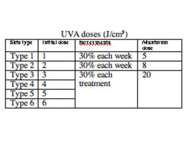 Modern units have integrated dosimetry and the time to deliver the correct dose is automatically calculated. For older units, irradiance is checked manually prior to treatment using a specific UVA dosimeter and the treatment time for a specific dose determined according to a spreadsheet.