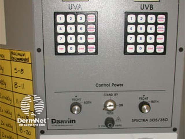 Modern units have integrated dosimetry and the time to deliver the correct dose is automatically calculated. For older units, irradiance is checked manually prior to treatment using a specific UVB dosimeter and the treatment time for a specific dose determined according to a spreadsheet.