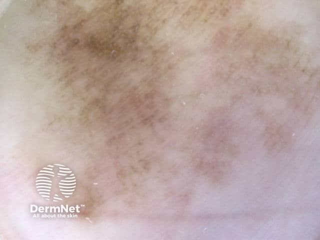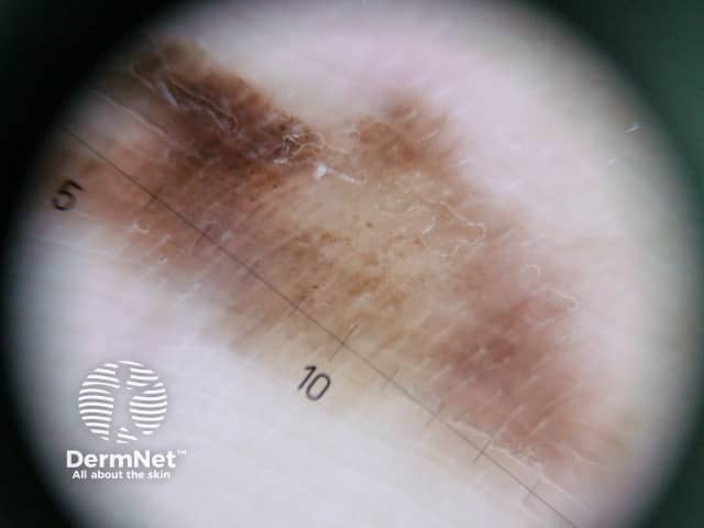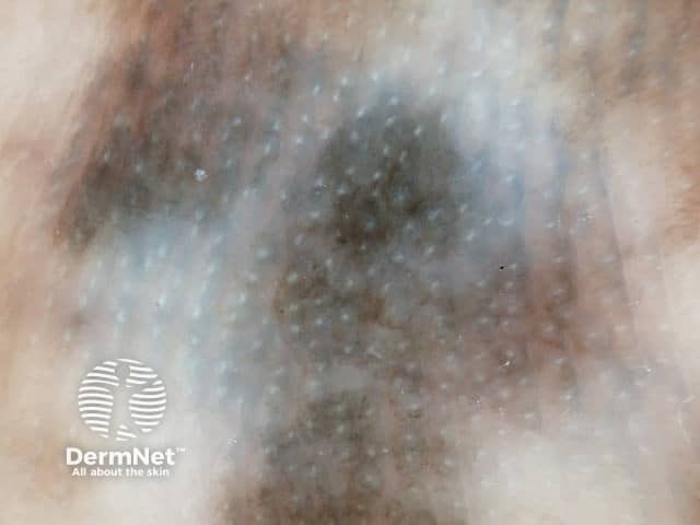 Dermoscopy of an acral lentiginous melanoma showing variable pigmentation and areas of regression
