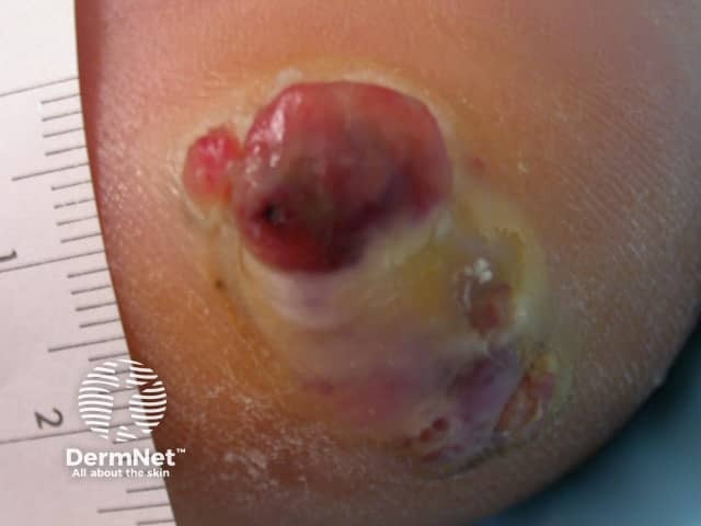 An irregular grey pigmented lesion on the toe that has become both hyperkeratotic and ulcerated on the toe tip