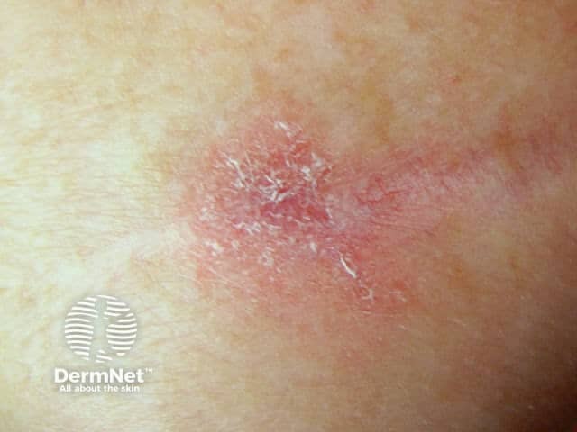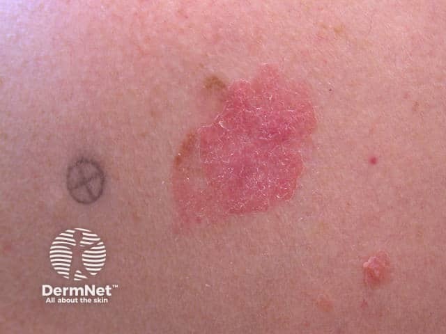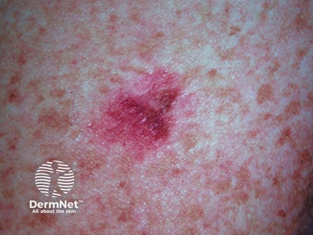 An irregularly marginated red lesion on the arm - an amelanotic melanoma (AM-patient1)