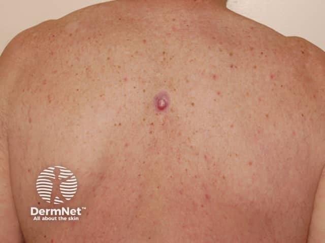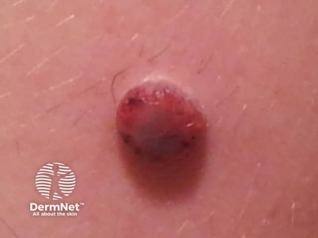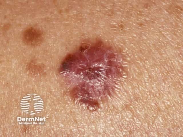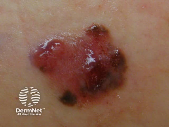 An irregularly pigmented lesion with a white nodule at the apex - an amelanotic melanoma (AM-patient2)