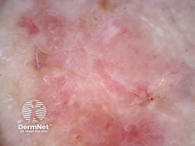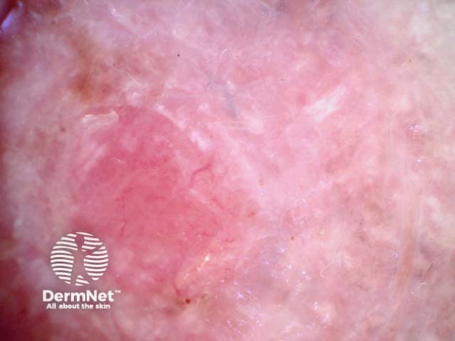Dermoscopy of an amelanolic melanoma showing non-specific blood vessels, structureless areas, multiple colours and only occassional brown dots (AM-patient1)