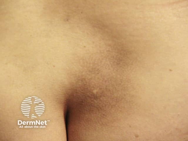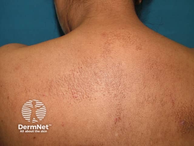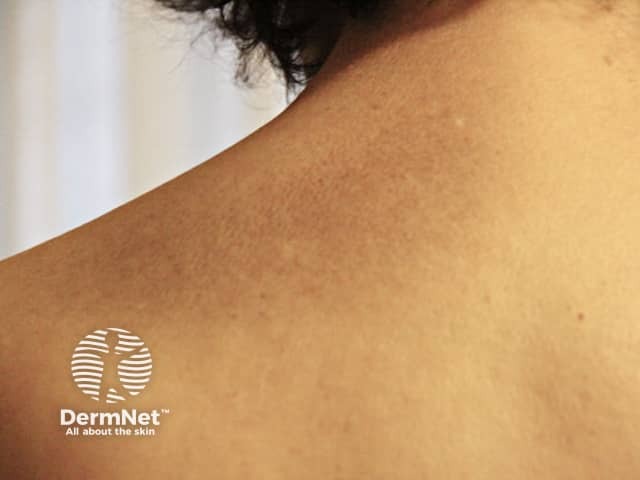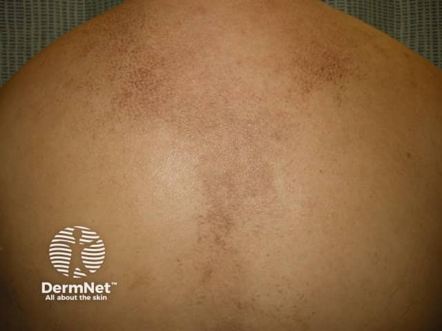 Macular amyloidosis showing rippled pigmetation over the upper back