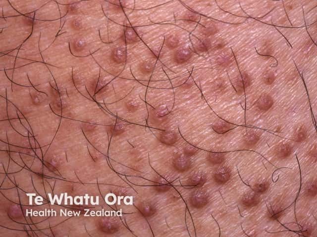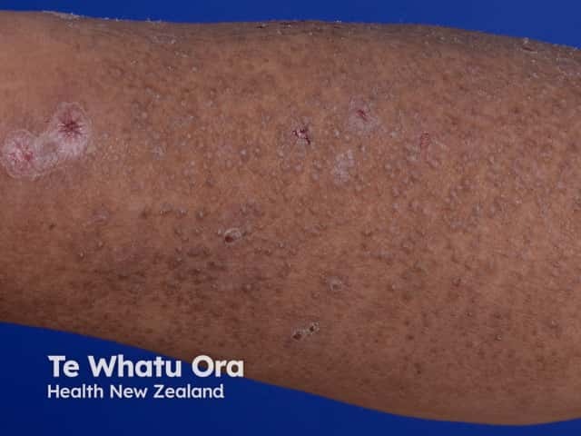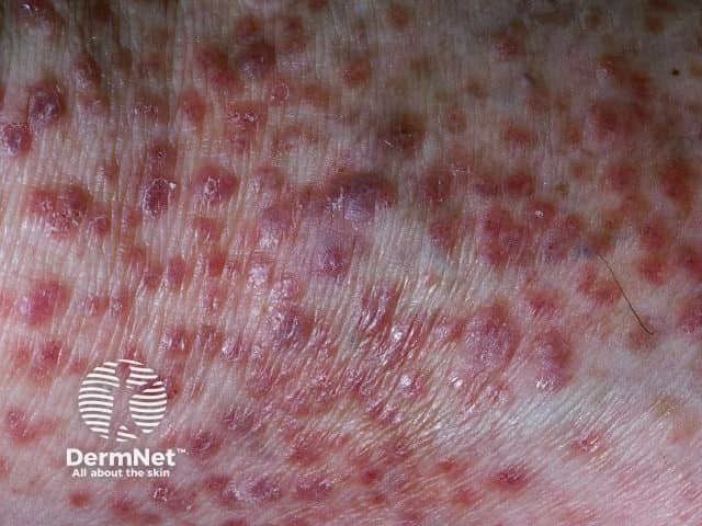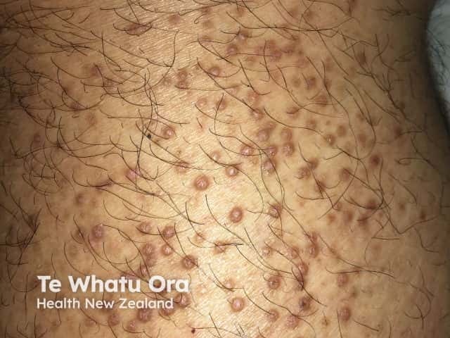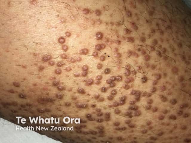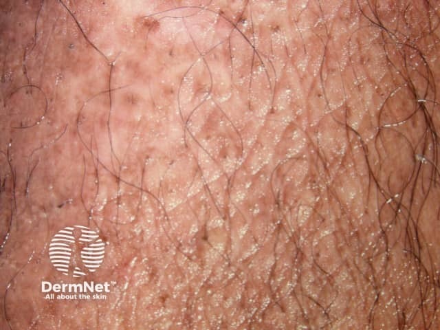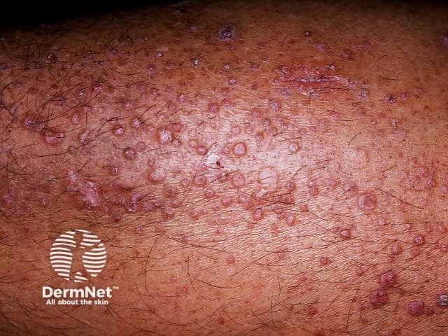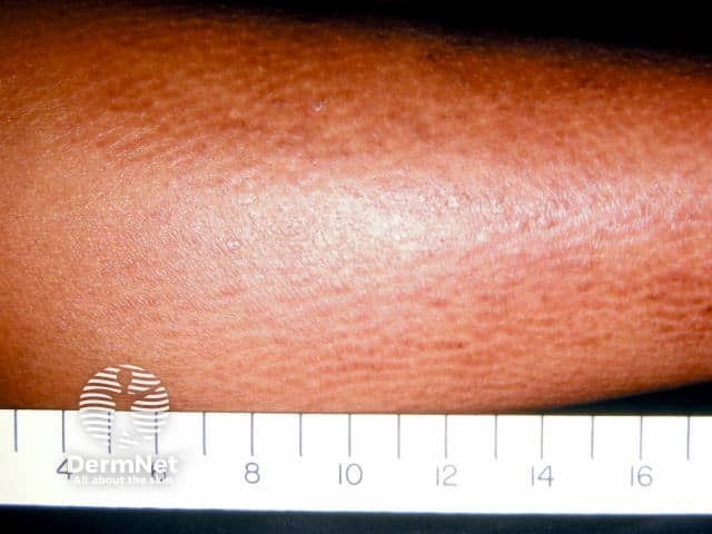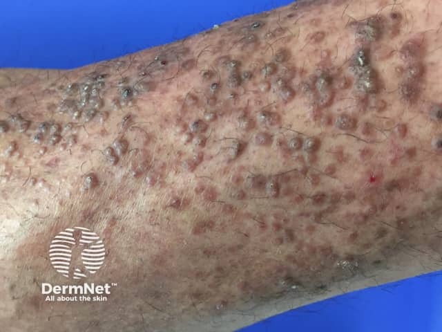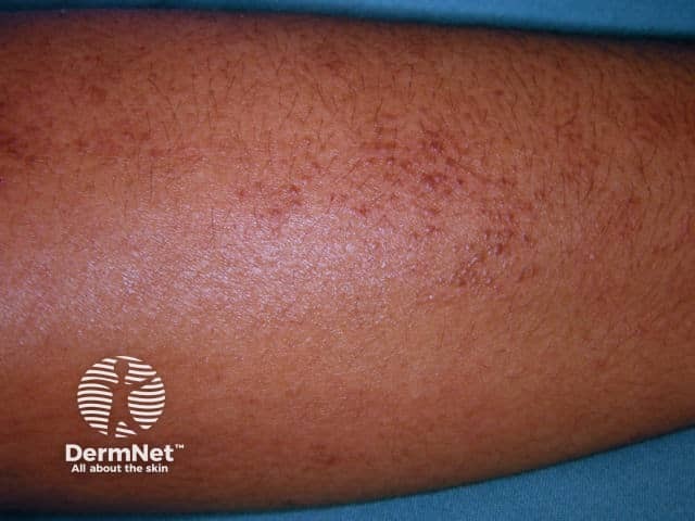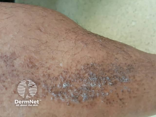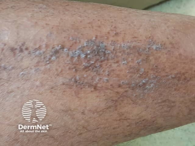 Scaly tan brown papules, some arranged lineraly in lichen amyloidosis on the leg