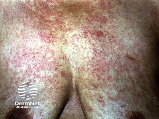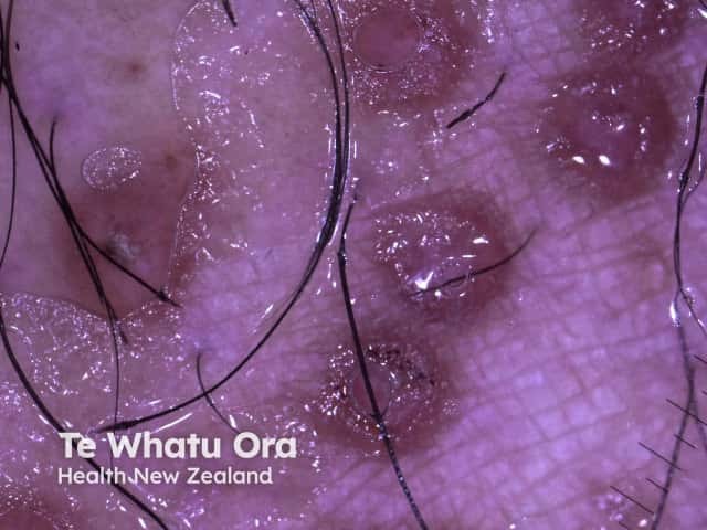 Multiple subtle dotted areas of hypopigmentation on a background of patchy hyperpigmentation