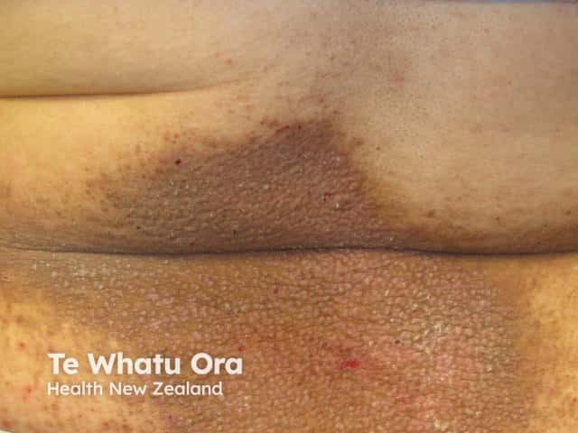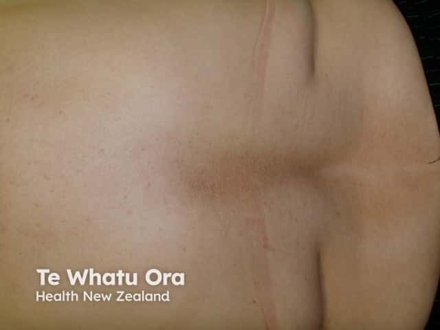 Repetitive scratching of an area of notalgia paraesthetica resulting in macular amyloidosis on the back