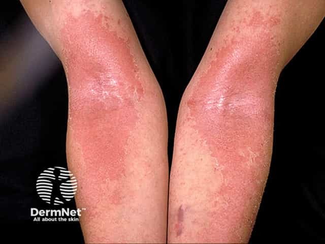 Bilateral erythema, scale and excoriation in atopic limb eczema