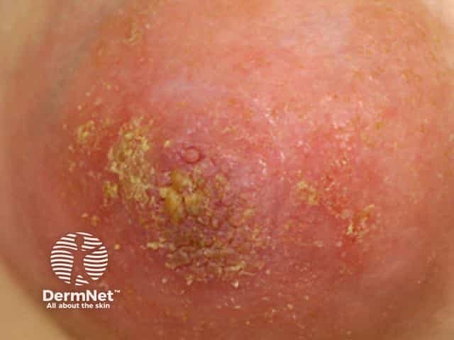 Atopic eczema in the antecubital fossae and nipples in a skin-of-colour woman