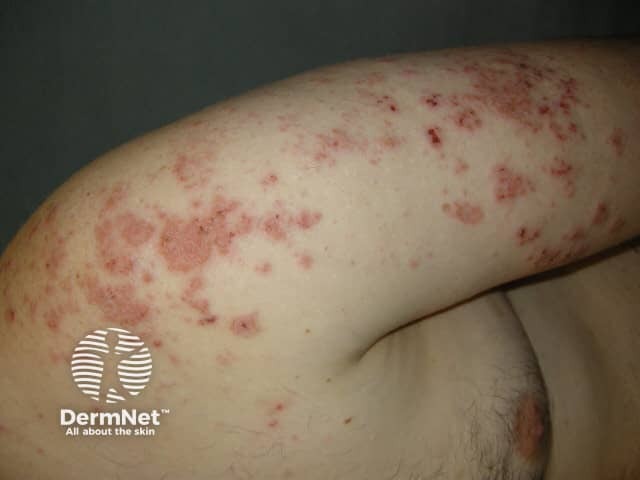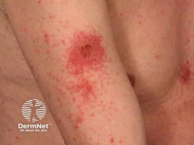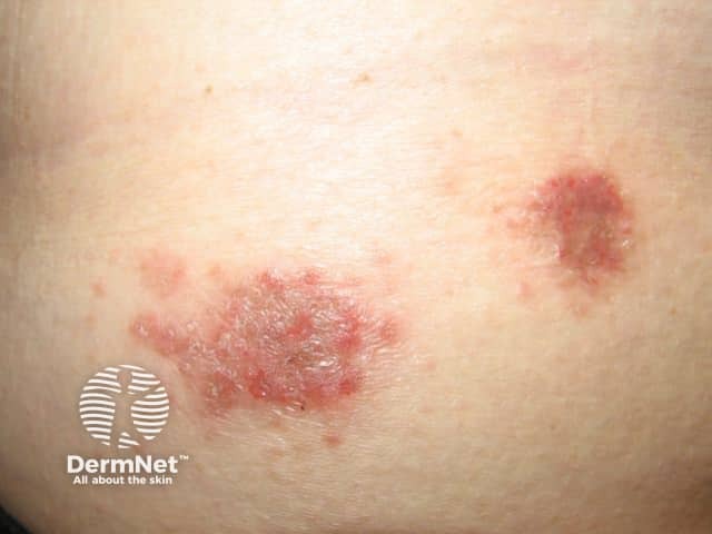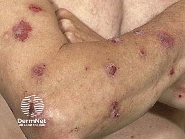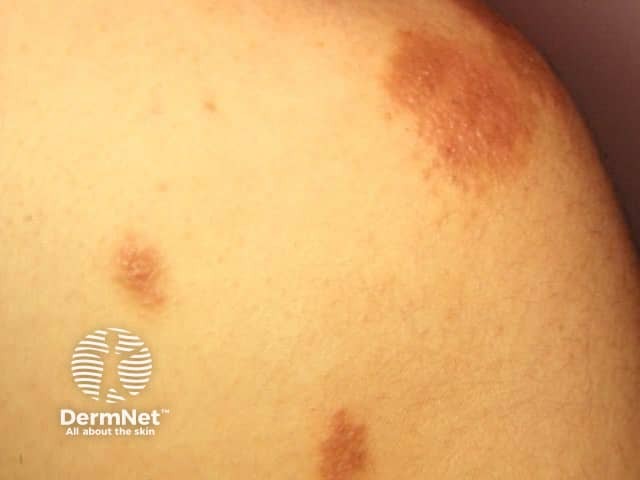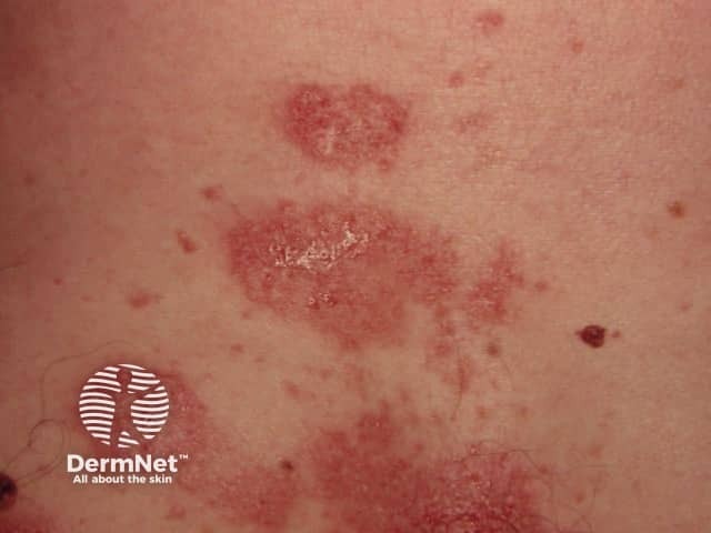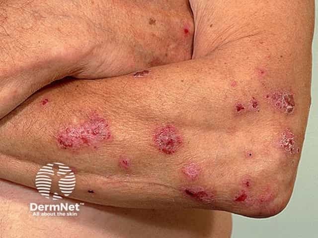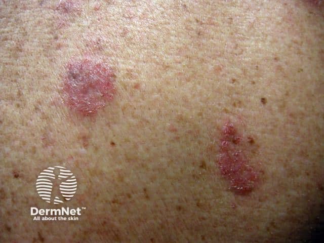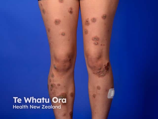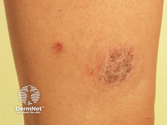 Scaling and hyperpigmentation from discoid eczema (NP-patient3)