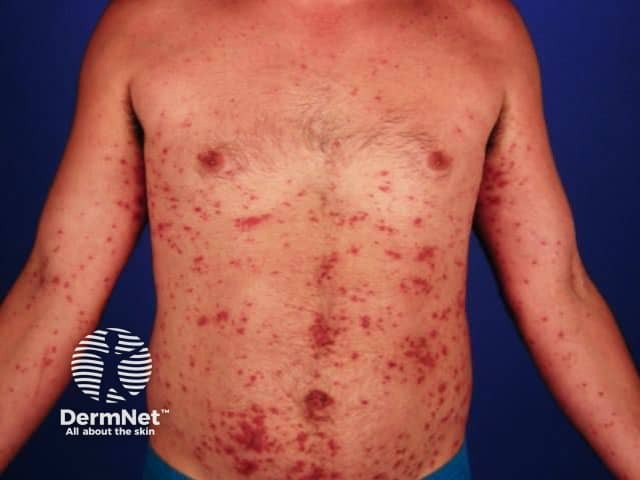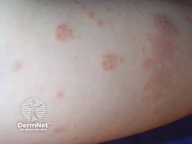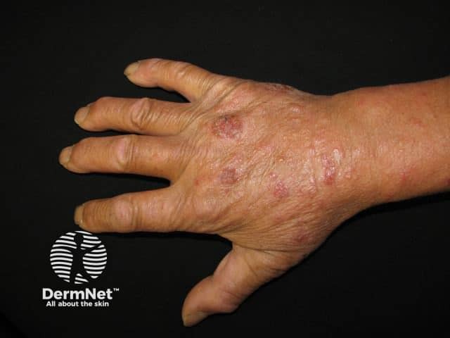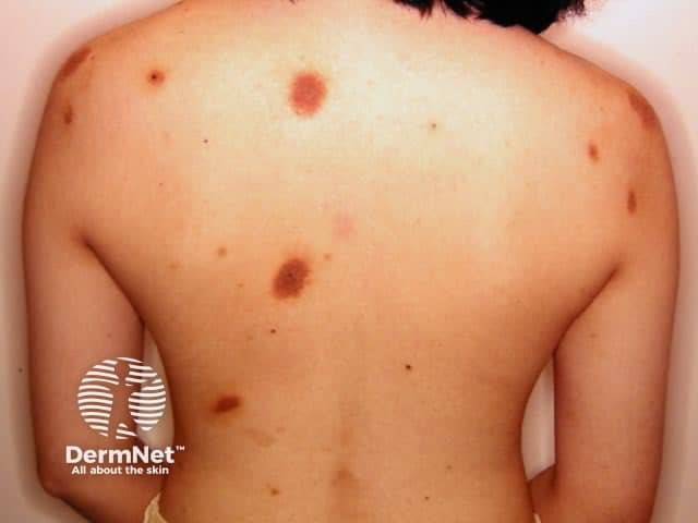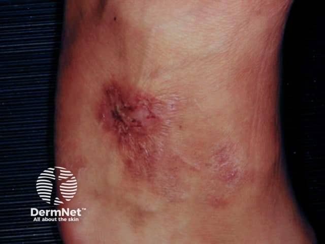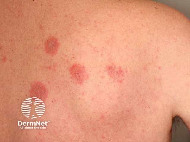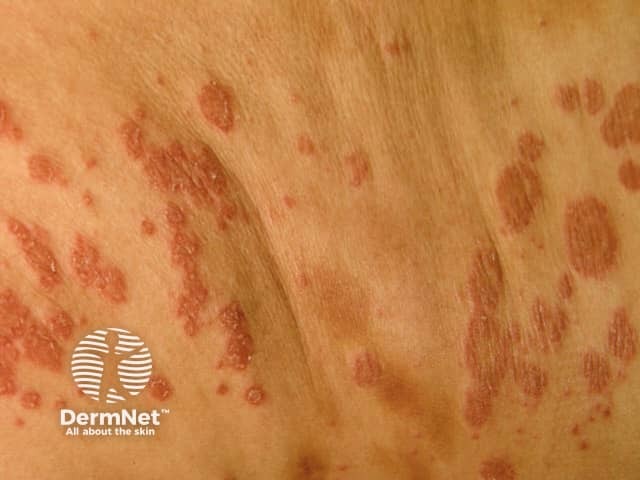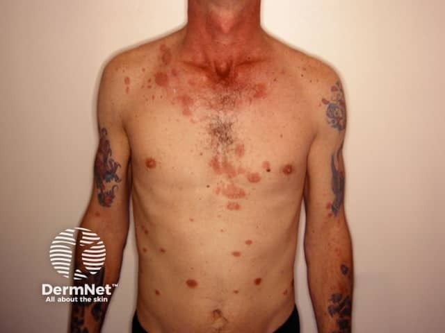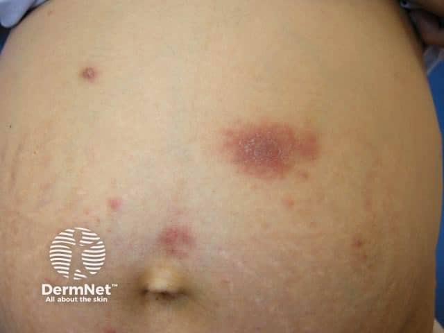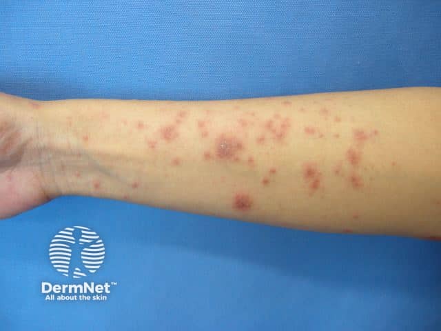 Scaling and hyperpigmentation from discoid eczema (NP-patient3)