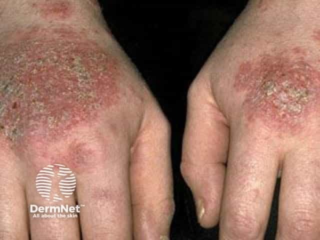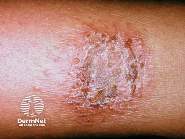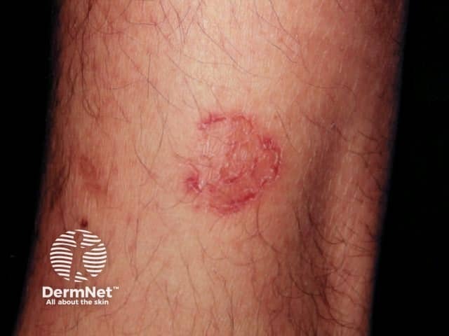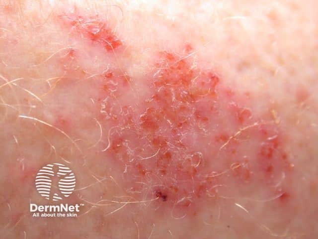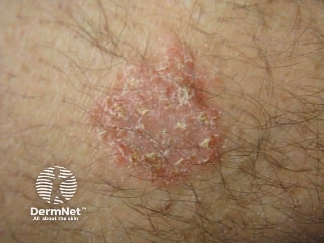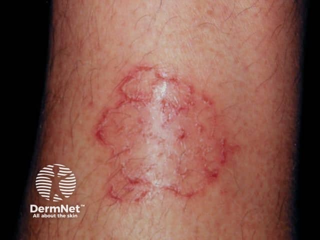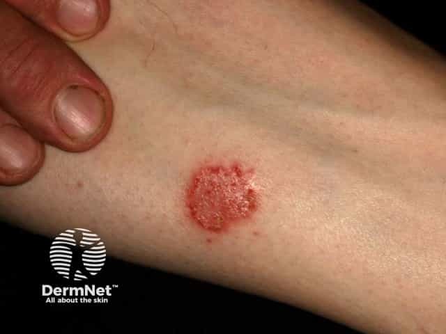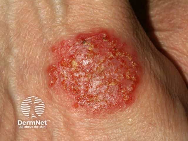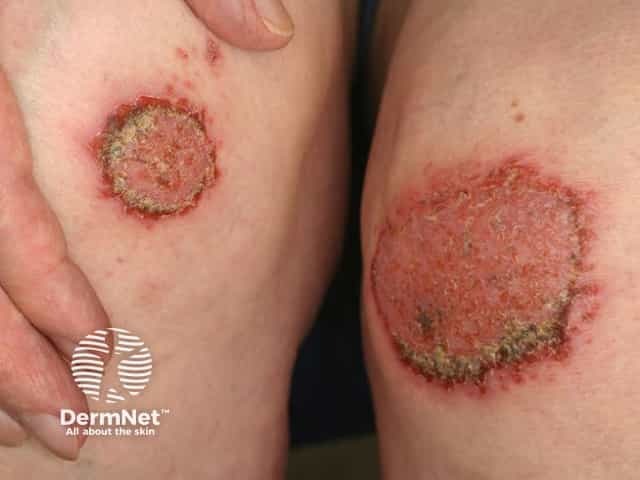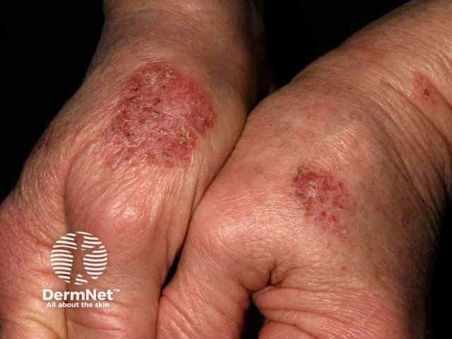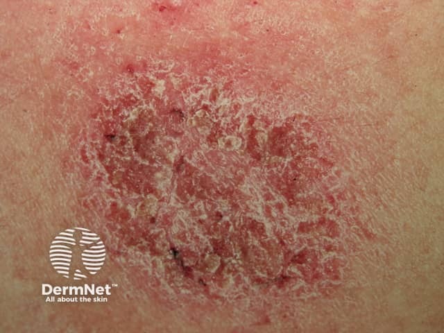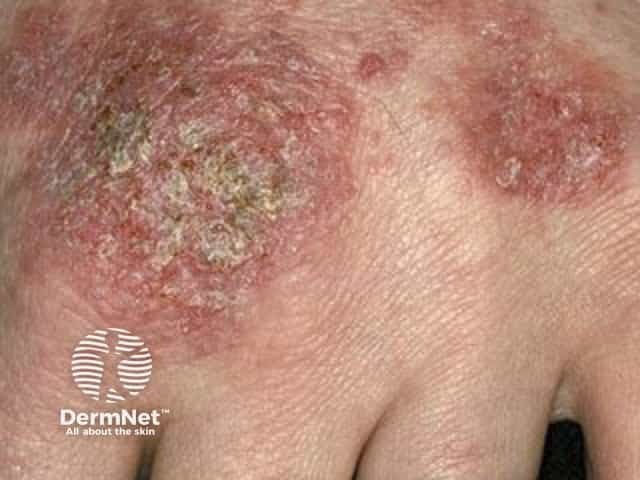 An oozing and fissured discoid eczema plaque (ND-patient1)