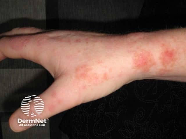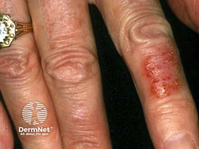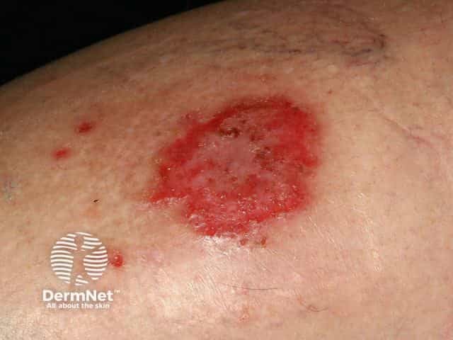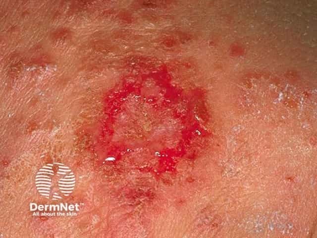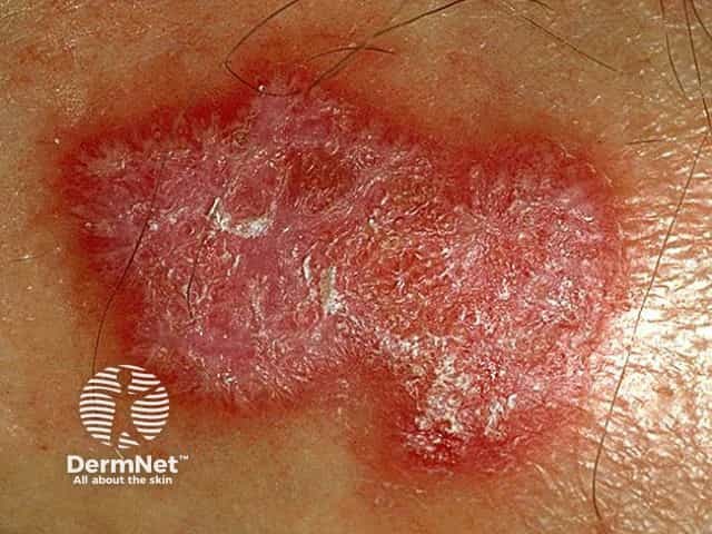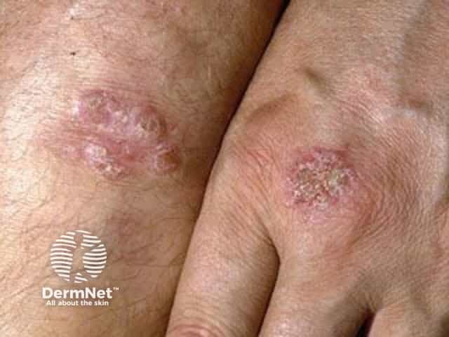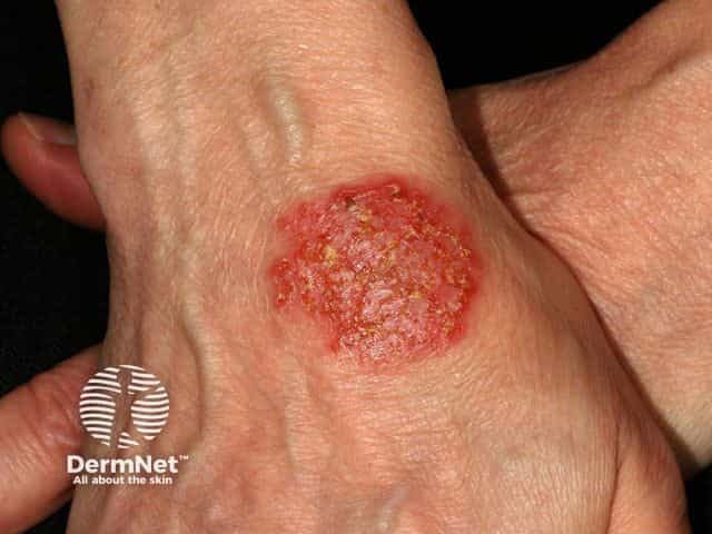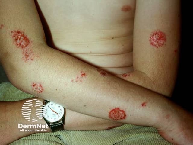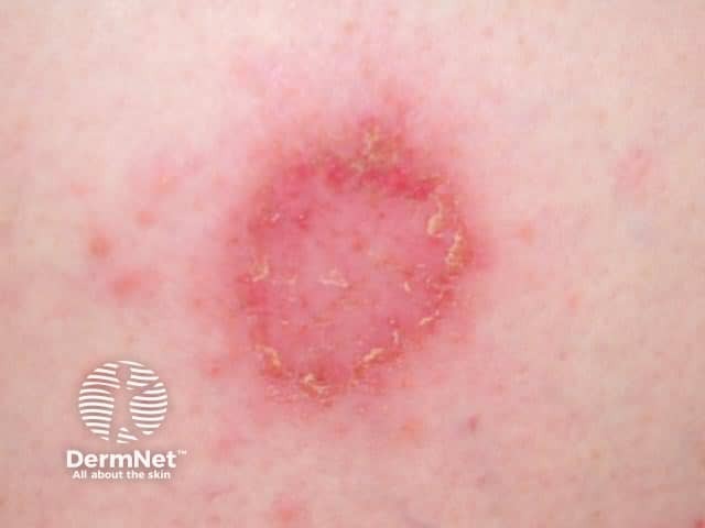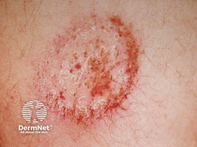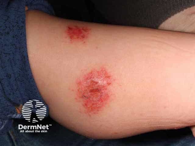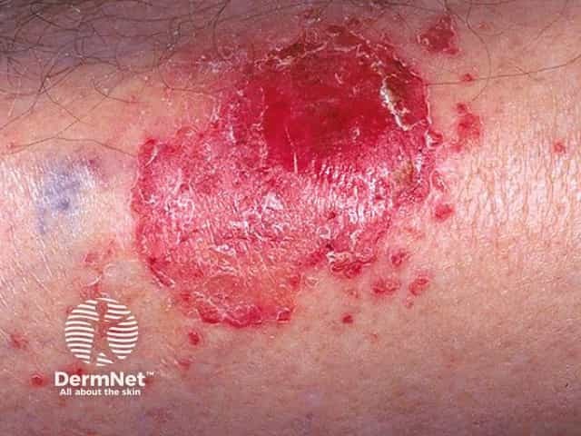 An oozing and fissured discoid eczema plaque (ND-patient1)
