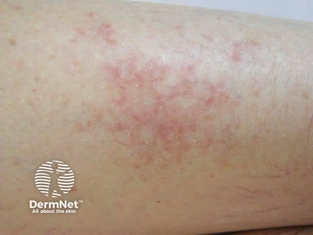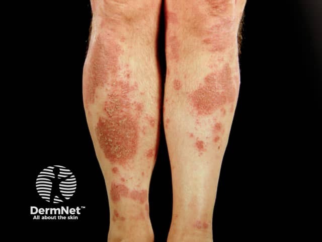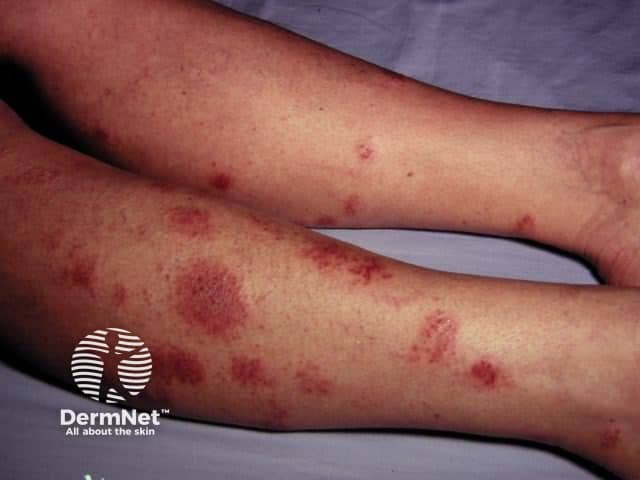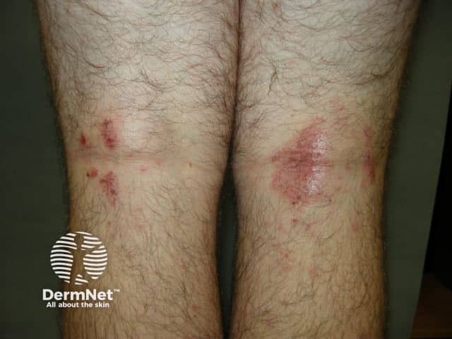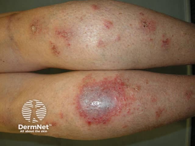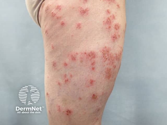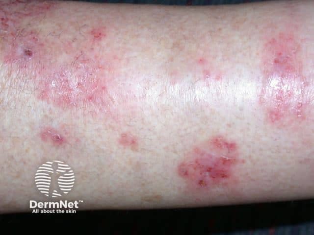 Scattered patches of discoid eczema on the legs (ND-patient1)