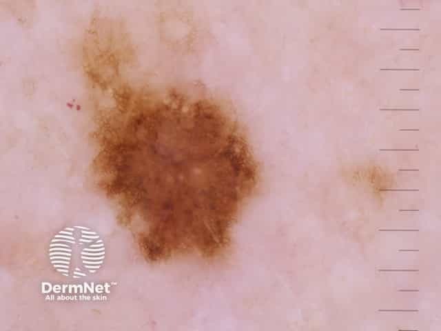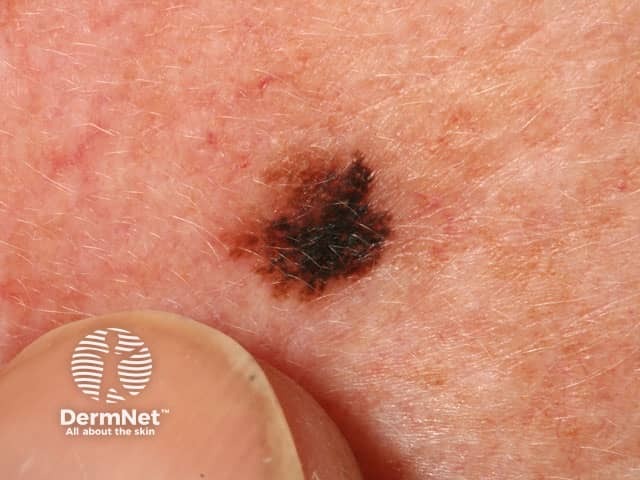 A dark, irregularly pigmented impalpable macule on the cheek - histology showed a lentigo maligna with early areas of invasion, Breslow thickness 0.2 mm