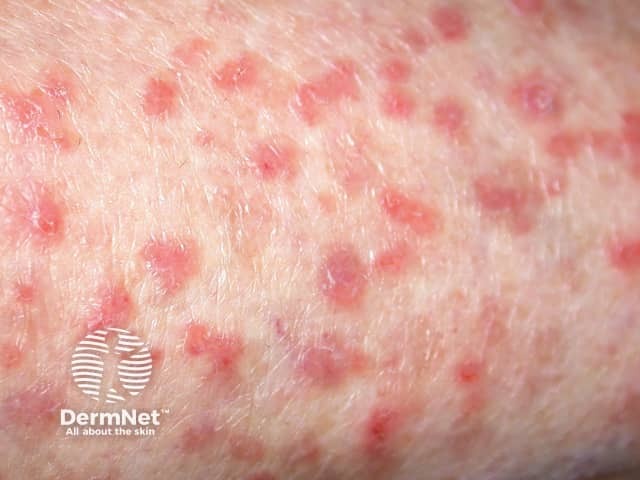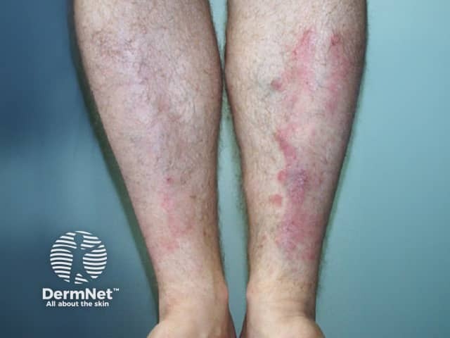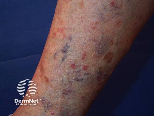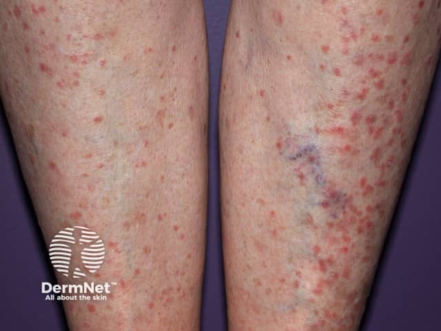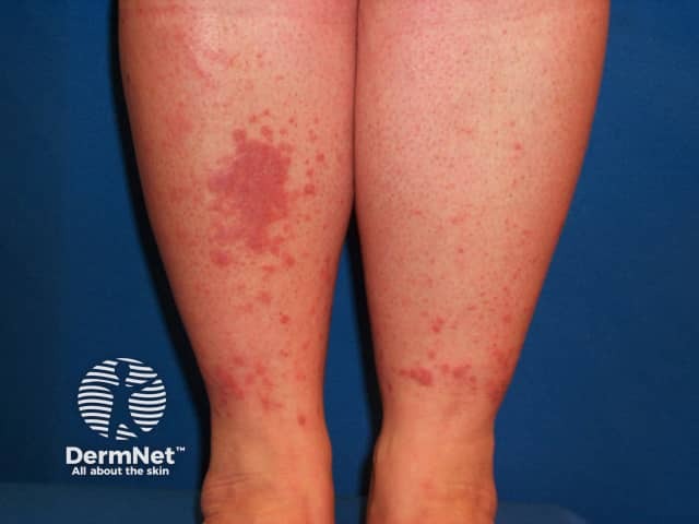 Raised excoriated purple shin plaques due to hypertrophic lichen planus