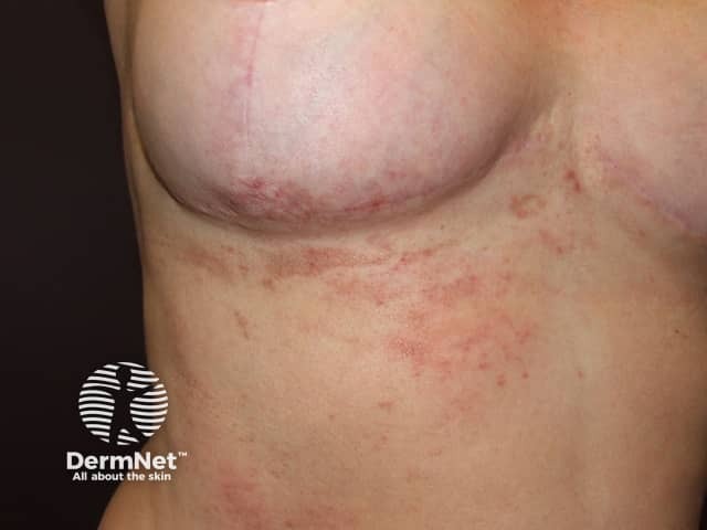 Lichen planus keobnerising within recent shingles producing a linear plaque