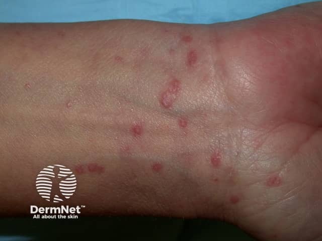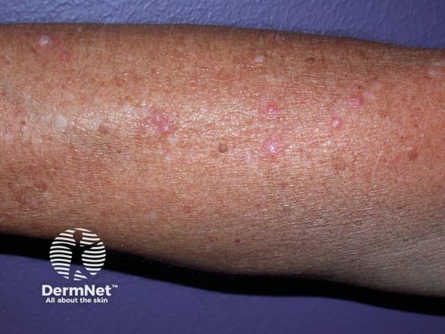 Flat topped, shiny, polygonal papules of lichen planus on the volar wrist (PLP-patient1)