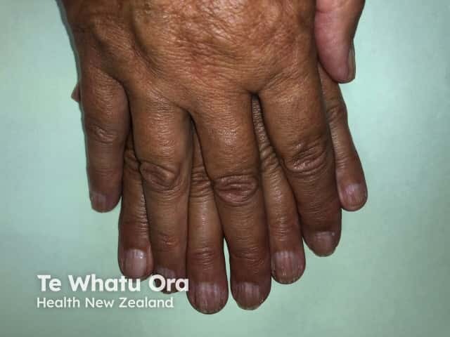 Ridging and roughness (onychorrhexis) of the finger nail plates due to nail unit lichen planus