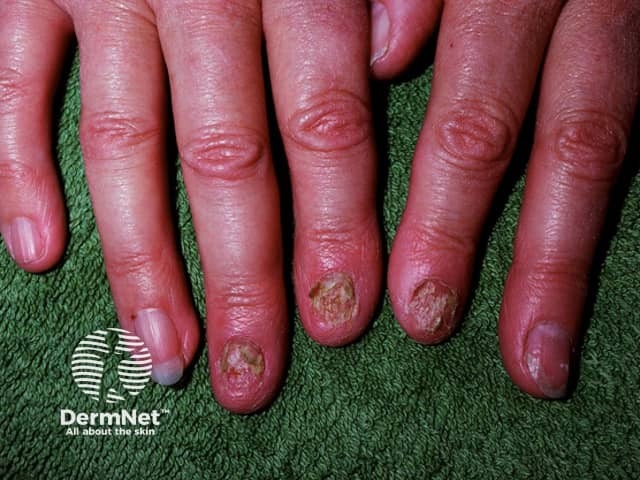 Distal and lateral onychomycosis of several nails (ONYC-patient5)