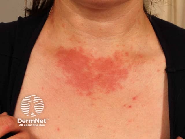 Erythematous papules on the recently sun-exposed 'V' area of the chest due to polymorphic light eruption