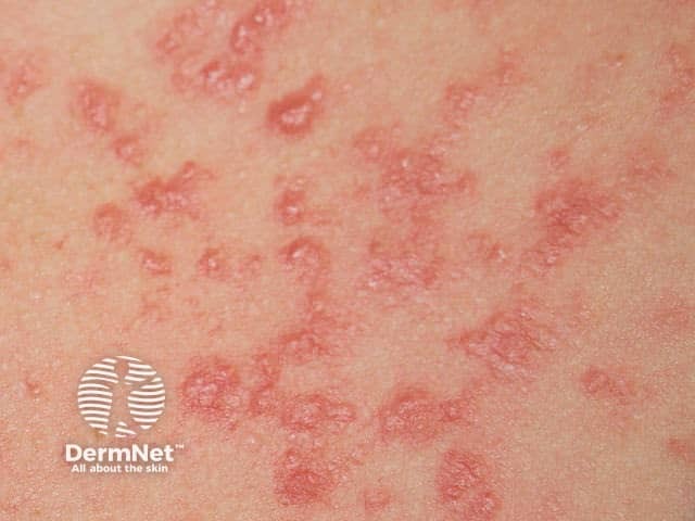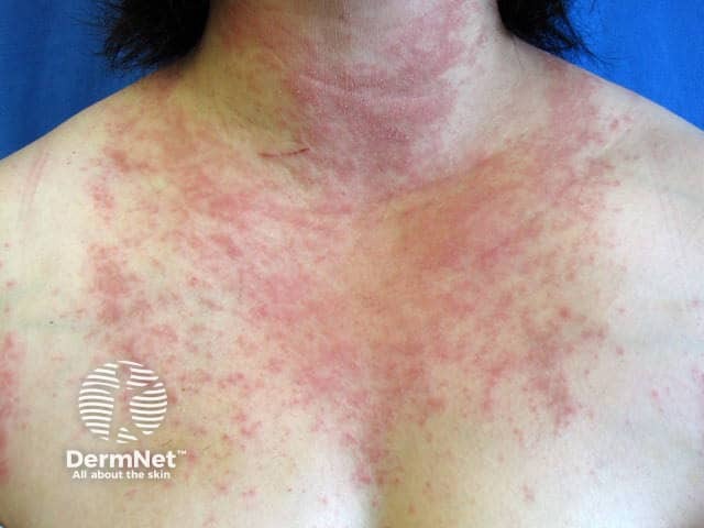 Papular polymorphic light eruption on the upper chest