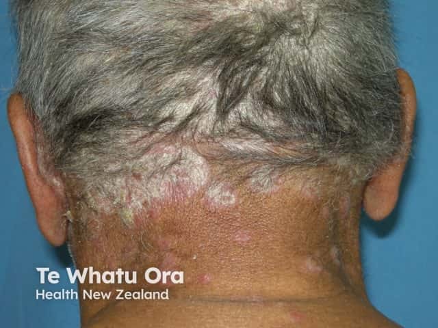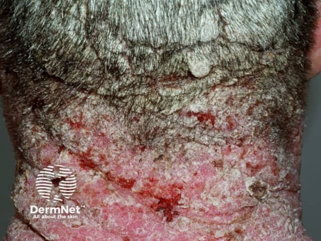 Scalp psoriasis extending onto the nape of the neck