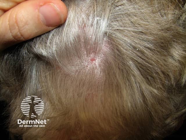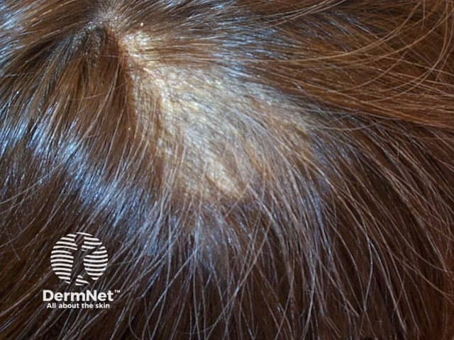Excoriated scalp psoriasis resulting in an area of localised hair loss - note the short broken hairs from rubbing