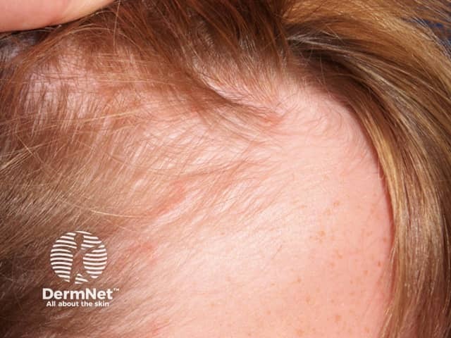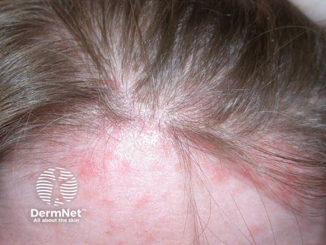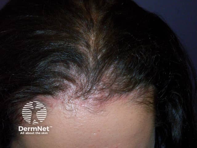 Well-circumscribed red scaly patches of psoriasis in the anterior hairline