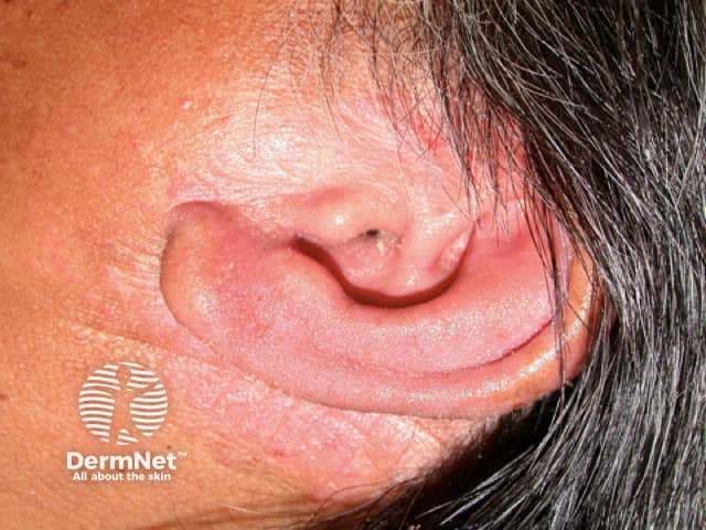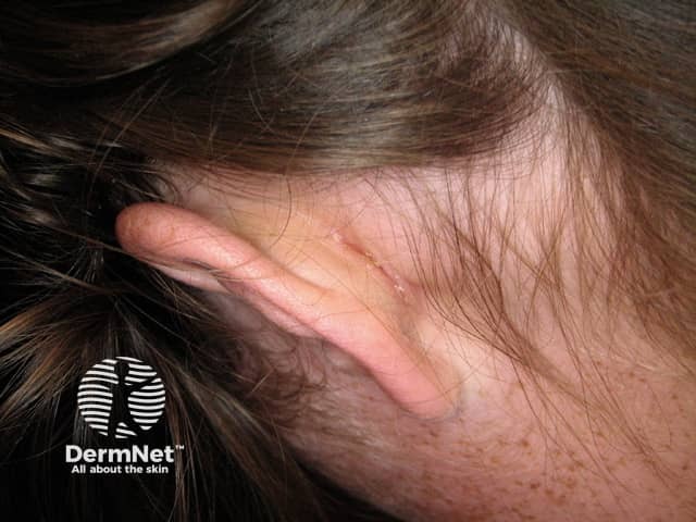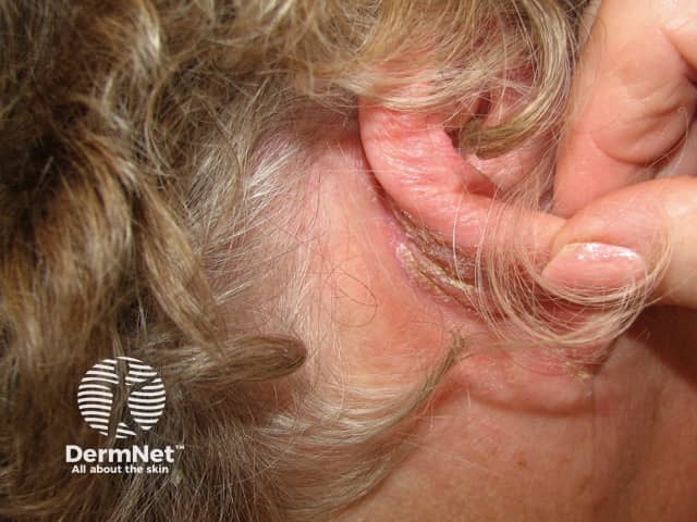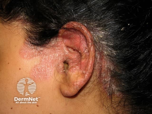 Severe exudative and hyperkeratotic psoriasis in the scalp, ears and retroauricular areas