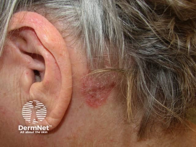 A well-defined patch of hyperkeratotic scalp psoriasis