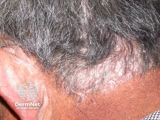 Extensive scaling over the parietal scalp due to psoriasis. There is psoriasis also in the ears and around the hair line