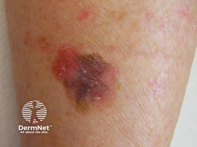 A thin invasive melanoma arising within an in situ lesion on the calf - note the irregular edge and notch (SSM-patient9)