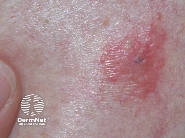A melanoma on the cheek showing clinical evidence of central regression
