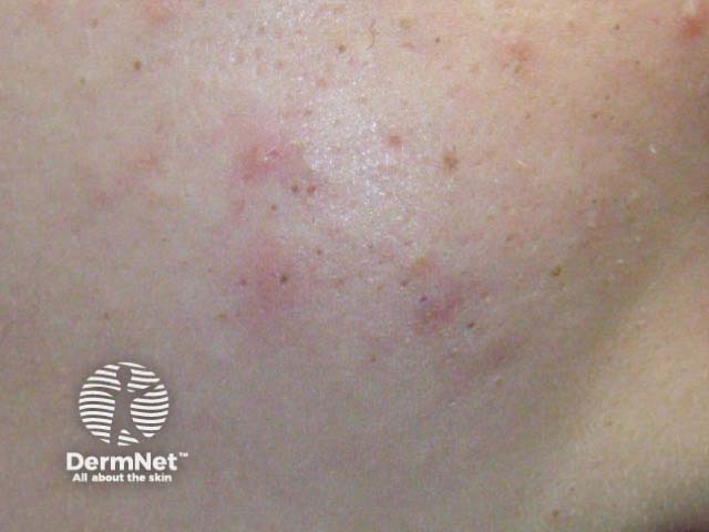 Acne usually affects the face, but it may affect the neck (especially under the jawline), anterior chest, shoulders and upper back. Rarely it extends to upper arms, lower back and buttocks. Rarely it may be segmental (cutaneous mosaicism) or limited to an epidermal naevus (Becker naevus, comedone naevus).