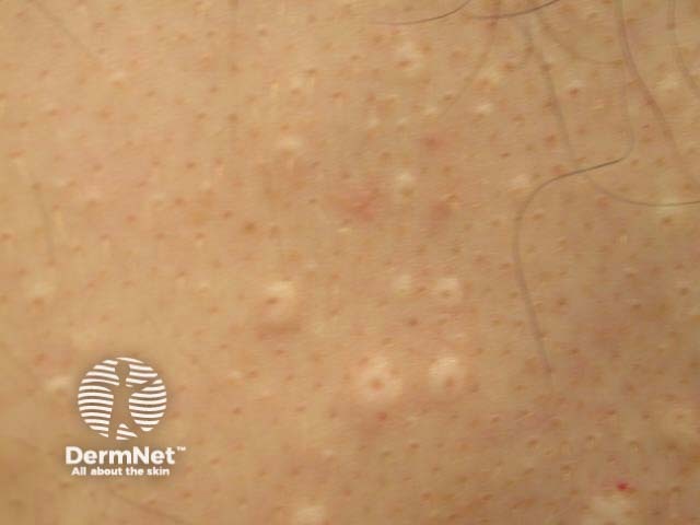 Follicular macular atrophy or perifollicular elastolysis presents as numerous white papules on the trunk.