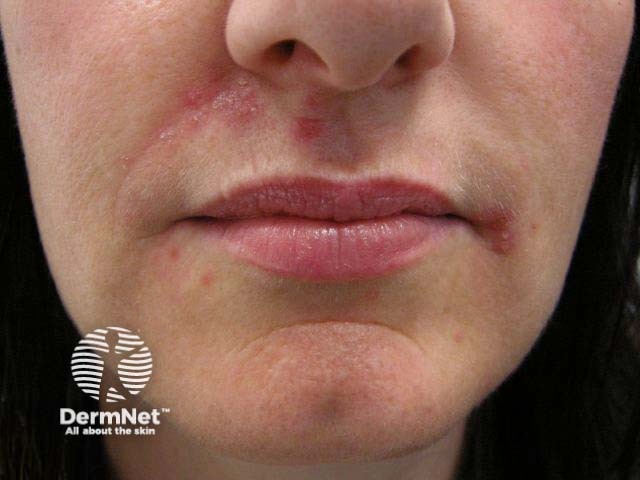 Periorificial dermatitis tends to favour the skin around the mouth and/or nose and/or eyes. There are clusters of erythematous papules or pustules, often with a scaly top, sparing the skin within a centimetre of the vermilion of the lip. Periorificial dermatitis is common in females in their 20s and 30s. It is treated by avoidance of face creams, and if necessary, a 6 to 12-week course of tetracycline or erythromycin.