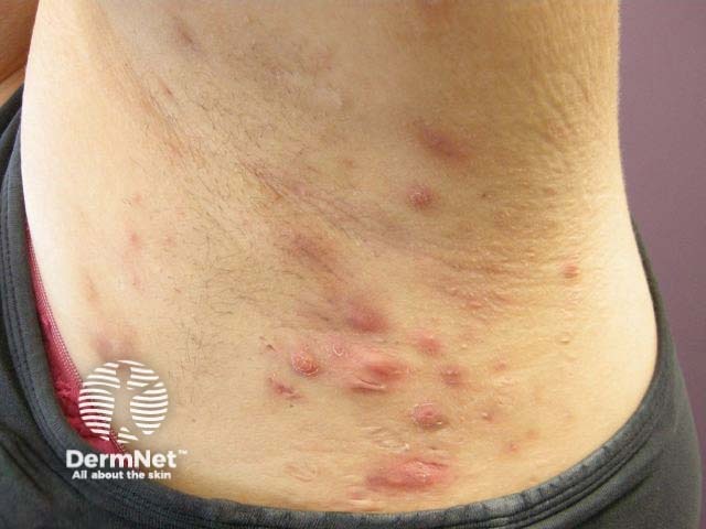 Acneiform eruptions in axillae, submammary sites and groins may be due to Hidradenitis suppurativa (acne inversa). Comedones, cysts, papules, pustules, nodules and sinuses may occur. The follicular occlusion syndrome is a rare genetic predisposition to acne conglobata, hidradenitis suppurativa, pilonidal sinus and dissecting cellulitis.
