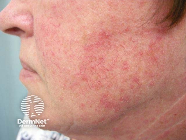 Rosacea tends to affect mid-forehead, nose, medial cheeks and central chin. Erythema, papules and pustules, and telangiectasia are characteristic. It is prevalent from 40 years upwards. It is treated with topical and oral antibiotics.